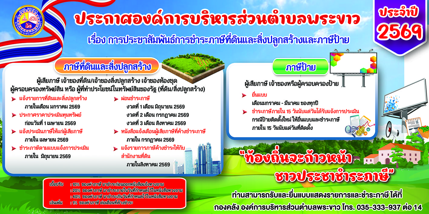 - ประกาศองค์การบริหารส่วนตำบลพระขาว เรื่องเพิ่มช่องทางการรับชำระภาษีและค่าธรรมเนียมต่างๆ , 2 มกราคม 2567