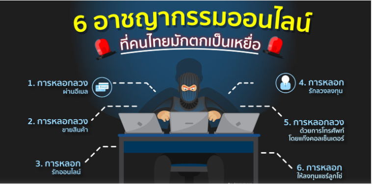 ปัจจุบันอาชญากรรมบนโลกออนไลน์ หรือ ‘อาชญากรรมทางไซเบอร์ (Cybercrime)’ โดยมิจฉาชีพเหลานี้ใช้เทคโนโลยีเพื่อหลอกเหยื่อให้หลงกลแล้วได้เงินมาแบบง่ายๆ เป็นภัยร้ายใกล้ตัวเพียงแค่ปลายนิ้ว เพียงแค่เปิดคอมพิวเตอร์หรือใช้งานอินเทอร์เน็ต คุณก็อาจจะตกเป็นเหยื่อจากอาชญากรรมทางไซเบอร์ได้โดยไม่รู้ตัว โดยอาชญากรรมทางไซเบอร์ ที่คนไทยมักจะตกเป็นเหยื่อบ่อยมากที่สุด